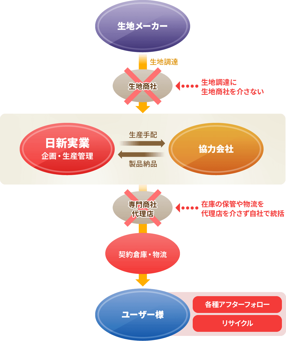 • 「素材調達」から「商品生産」「物流」「リサイクル」まで、一気通貫の体制でスムーズに管理できます。
